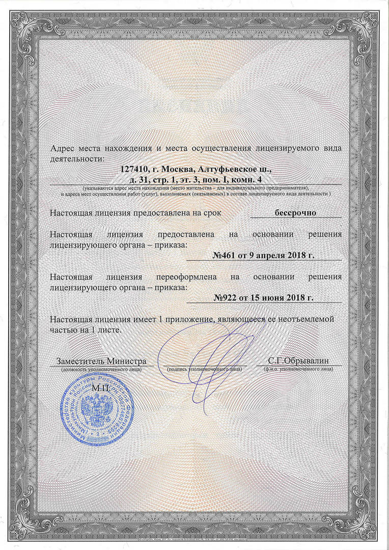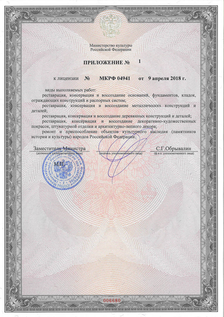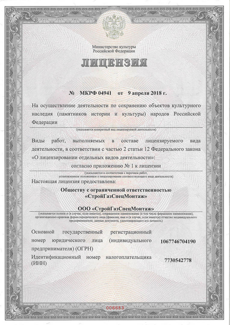 - Лицензия Министерства Культуры РФ на осуществление деятельности по сохранению объектов культурного наследия (памятников истории и культуры) народов Российской Федерации от 9.04.2018г.